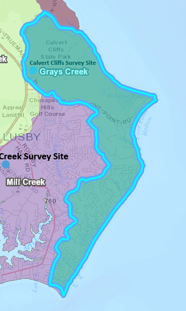 Gray’s Creek Watershed includes Calvert Cliffs State Park and stretches down towards the bottom of the county. The watershed is 4,503 acres and includes almost 7 miles of streams!