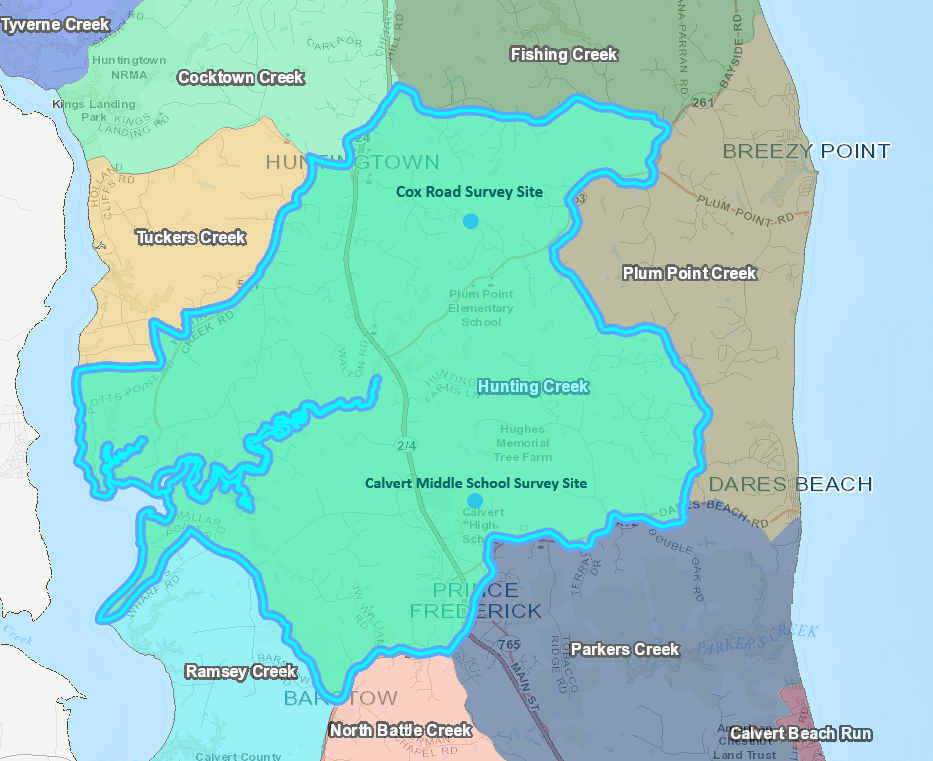 Hunting Creek Watershed is located between Huntingtown and Prince Frederick. It encompasses 19,229 acres and includes two of our survey points, one at Cox Road and the other at Calvert Middle!